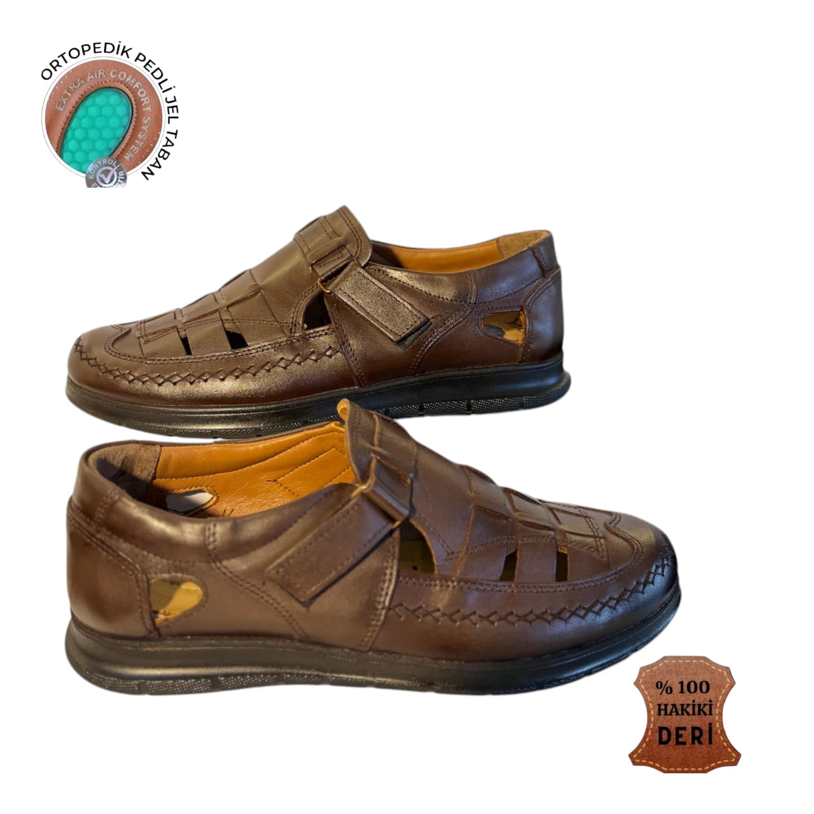 Bu hakiki deri erkek sandalet, konfor ve şıklığı bir arada sunuyor. Özel tasarlanmış jel tabanlı ortopedik yapısı sayesinde uzun süreli kullanımlarda bile ayaklarınızı rahat ettirir. Yaz mevsiminin vazgeçilmez aksesuarı olan bu sandalet, nefes alabilen deri yapısı ile ayak sağlığınızı korur. Günlük kullanıma uygun olan bu sandalet, hem casual hem de smart casual kombinlerinizi tamamlar. Topuk kısmındaki özel tasarım, yürüyüş konforunuzu artırırken, jel tabanlık ayağınızın doğal formunu destekler. Her adımda konfor sunan bu sandalet, dayanıklı yapısı ile uzun ömürlü kullanım sağlar. Günlük aktivitelerinizde rahatlıkla tercih edebileceğiniz bu sandalet, klasik tasarımı ile her tarza uyum sağlar
